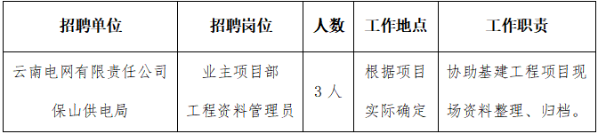 為支撐業(yè)務(wù)發(fā)展,解決臨時性、短期性人力資源緊缺問題,依據(jù)國家法律法規(guī)及公司規(guī)章制度規(guī)定,結(jié)合保山供電局實際情況,現(xiàn)面向社會公開招聘短期項目制用工3人,具體事項公告如下: